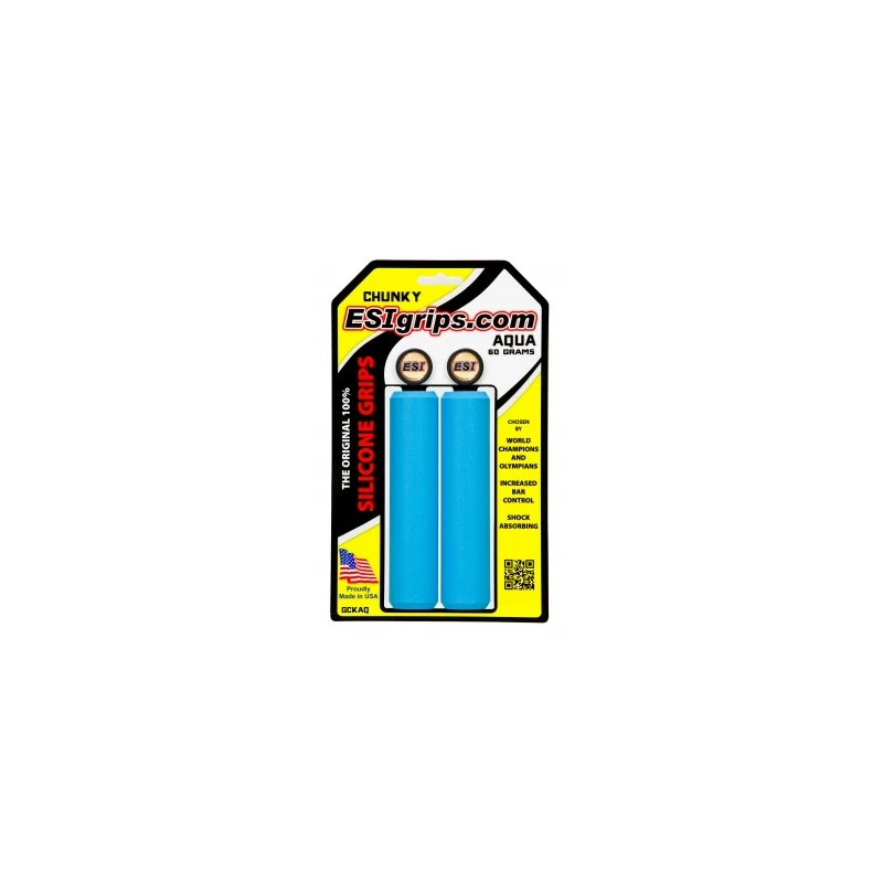Les célÚbres grips silicone ESI Grips Chunky, en pur silicone, ne glissent pas sur le cintre, procurent un trÚs bon confort, densité agréable, se lavent facilement, résistent aux UV, ne craquellent pas, et permettent une bonne préhension, quelque soient les conditions météo.