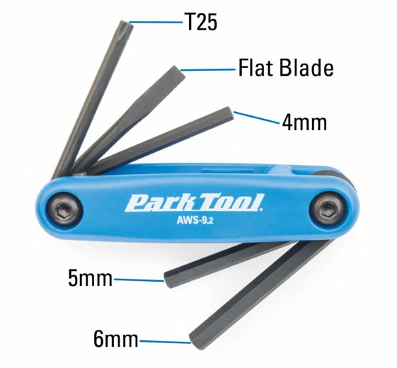 Le Set Park Tool Escamotable Clé hexagonale combine 4, 5 et 6 mm hexagones, un tournevis à lame plate et un pilote compatible T25 Torx en un seul outil pliant pratique.